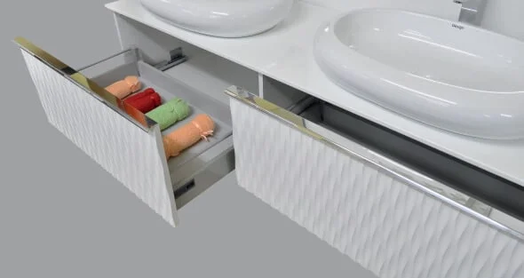Έπιπλο μπάνιου κατασκευασμένο από MDF, με φινίρισμα σε κομψή λευκή λάκα, που αποπνέει καθαρότητα και μοντέρνα αισθητική. Οι ανάγλυφες λευκές πόρτες προσθέτουν διακριτική υφή και στυλ στο σύνολο, ενώ οι μηχανισμοί με φρένο εξασφαλίζουν αθόρυβο και ομαλό κλείσιμο. Το έπιπλο διαθέτει δύο ευρύχωρα συρτάρια, που προσφέρουν πρακτικότητα και άνεση στην αποθήκευση. Συνοδεύεται από νιπτήρα πορσελάνης και πολυτελή πάγκο γυαλομάρμαρο, δημιουργώντας ένα αρμονικό και εκλεπτυσμένο αποτέλεσμα για μπάνια υψηλών προδιαγραφών.