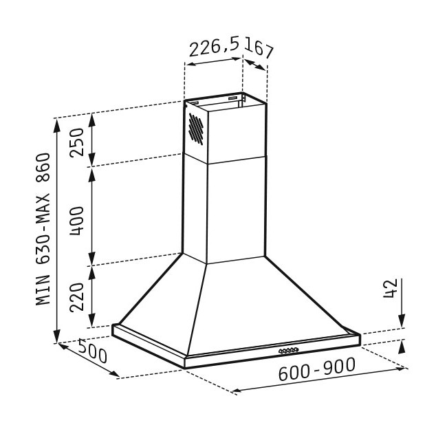 Απορροφητήρας τοίχου από ανοξείδωτο με υψηλή απορροφητικότητα έως 600 m³/h και λειτουργία χαμηλού θορύβου. Διαθέτει LED φωτισμό και ισχυρό μοτέρ 140W, προσφέροντας αξιόπιστη απόδοση και μοντέρνο σχεδιασμό για κάθε κουζίνα.