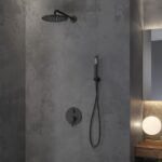 Πλήρες σετ μπαταρίας εντοιχισμού με επιτοίχιο μπράτσο και κεφαλή ντους INOX Ø200 mm. Περιλαμβάνει τηλέφωνο χειρός, σπιράλ PVC 150 cm, μπρούτζινη παροχή νερού με βάση στήριξης και εντοιχισμένο μίκτη 4 δρόμων για πολλαπλές επιλογές χρήσης και άνεση στο μπάνιο.